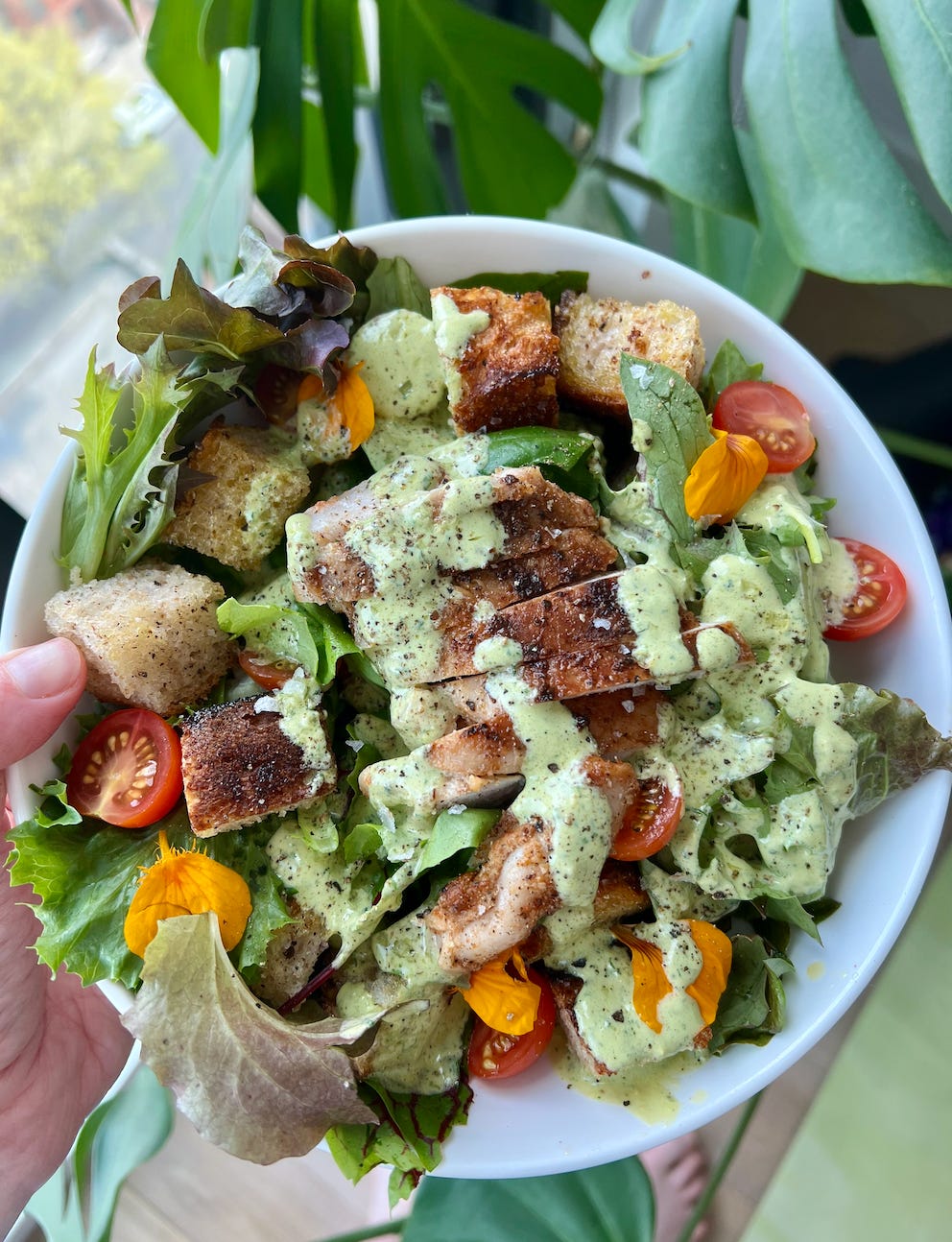 I hope you enjoy this recipe. Before you go, might I also suggest using a bit of your leftover deviled egg filling to make a delicious salad dressing like I did below? I just thinned out the remaining few tablespoons of filling with a little lemon juice and olive oil and drizzled it over some greens, croutons, tomatoes and chopped chicken thighs for a quick lunch.