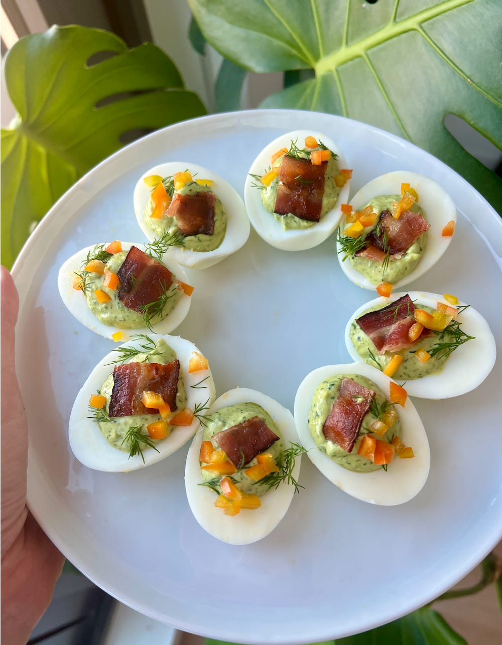 In my recipe, I also suggest garnishing these herby deviled eggs with some pieces of bacon, extra dill fronds, and diced pepper for additional crunch. You definitely don’t need to fuss over the garnishes as much as I did though - the eggs are just as tasty without them. I personally love a bell pepper garnish because it reminds me of confetti and it feels a little playful, but you certainly don’t need to get hung up on it. A pinch of paprika or fresh grind of black pepper will be enough.