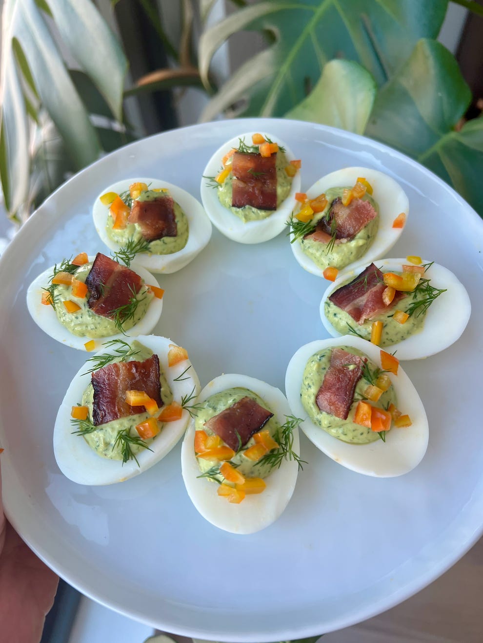 Herby Deviled Eggs with Anchovy and Creamy Avocado garnished with Crispy Bacon, Peppers and Dill